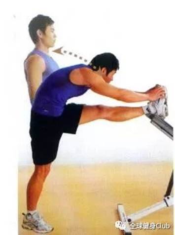 单脚站立,另一脚脚尖放到一固定物上,挺直身体,脚伸直往前压。左右各做2到3次,每次坚持20到30秒。