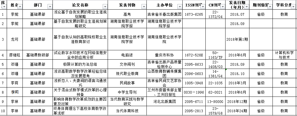 2018年基础课部公开发表论文统计