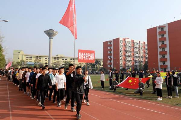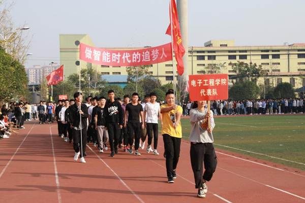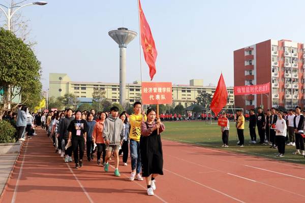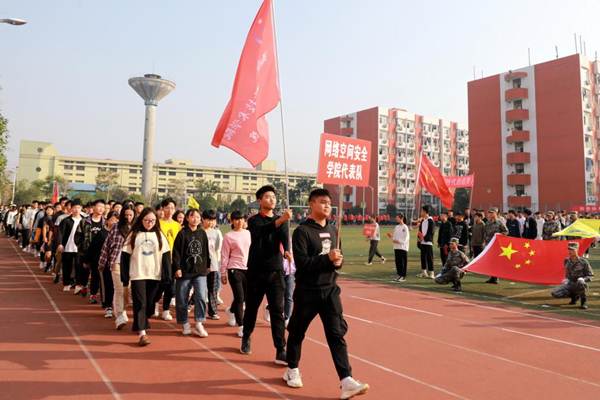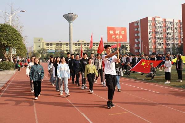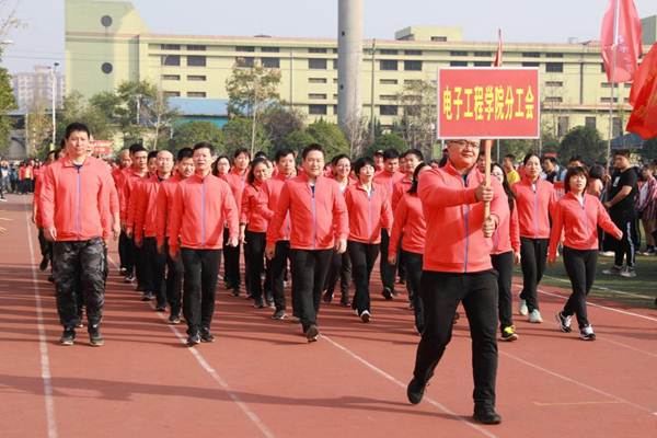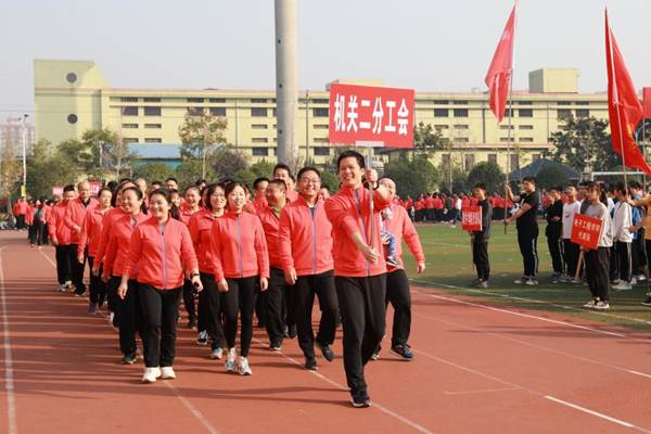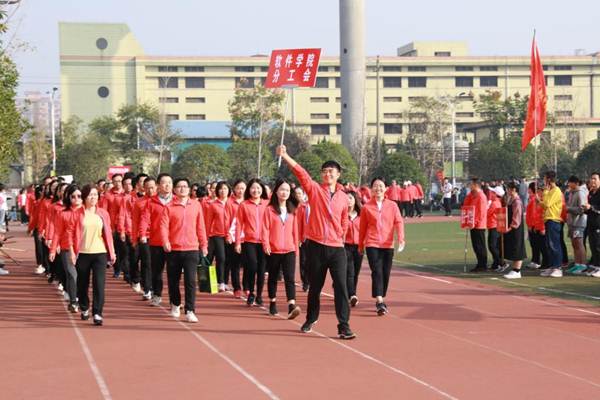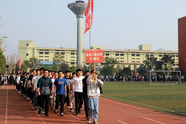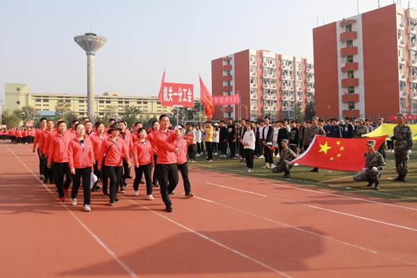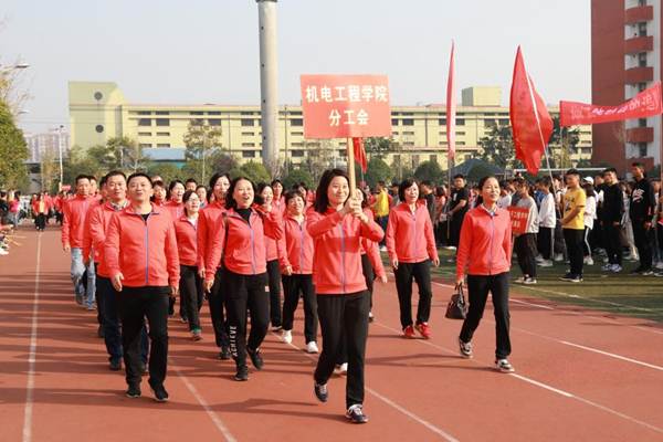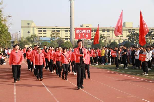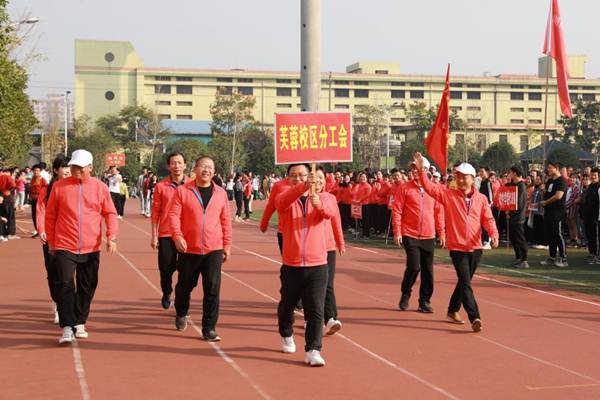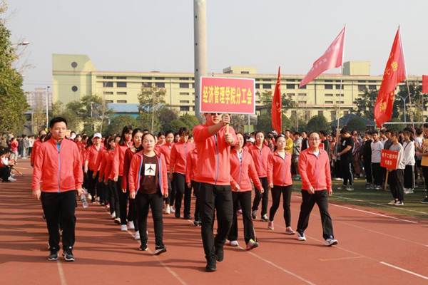 开幕式伊始,国旗护卫队、校旗护卫队、裁判员方阵队、各二级学院方阵队、各分工会方阵队依次入场,队列步伐整齐有力,口号坚定嘹亮。