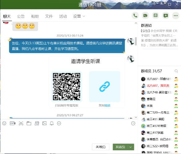 采用“学习通”+“直播串讲答疑”的教学模式。学习通平台的在线学习,其优势在于学生可以根据自己的理解程度,有针对性的反复观看某些知识点或跳过已掌握知识点,实现学习时间及听课内容的自我控制。结合 “腾讯课堂”直播的方式,对每个章节的内容进行串讲,并集中解决学生提出的疑难问题。班级QQ群是师生沟通交流的主要工具。上课前30分钟在QQ班级群提醒同学们即将开始上课,开课前5分钟,组织同学们进入学习通签到。