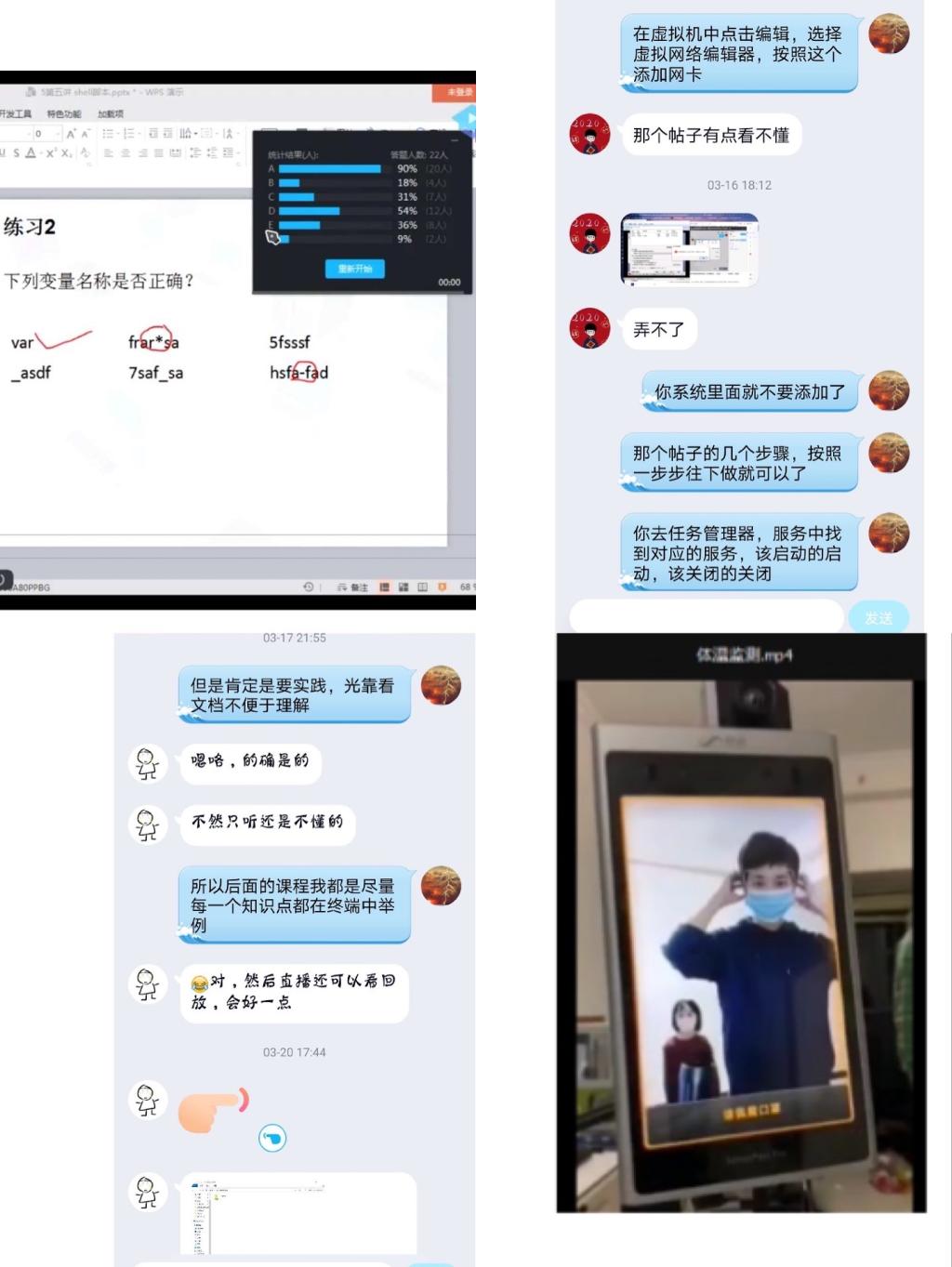 为了确保不同层面学生的学习效果,张雷老师采用课堂内容重放以及课后答疑同步跟进的方式。对于部分学习主动性较差的同学,利用学习通进行任务督导;而对于主动性较高的同学,利用QQ和微信等方式,随时随地开展讨论及答疑,从精神上给予必要的支持,鼓励开展自我学习和钻研;针对部分学生的迷失感,从未来企业的需求以及学生个人的发展方向给予中肯的建议,提升学生的专业实力和自信心。