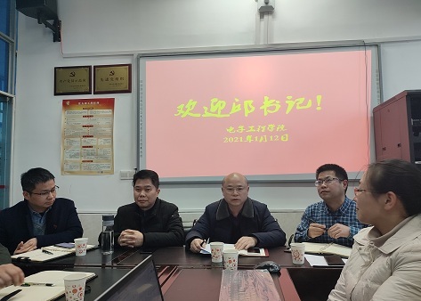 电子工程学院院长雷道仲对邱立国表示真诚的欢迎,希望邱书记能够尽快融入到电子工程学院,投身到工作中,熟悉环境,团结一心、真抓实干、开拓创新,让电子工程学院的各项工作实现新跨越。