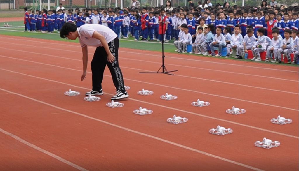 学生们沉浸式听了志愿者讲解关于无人机基本结构、分类和应用等基础知识,体验式观摩了无人机表演志愿者飞手佩戴专业VR眼镜,手持遥控操纵飞行器如行云流水。冲到上空的飞行器宛如一只只翱翔天际的雄鹰,在空中时而翻转出优雅的弧线,时而以250km/h的速度直飞上空,时而灵活变换姿势和队形。学生们鼓着掌激动地说“这简直就是空中F1,太酷了,我要更加努力学习,争取当一名无人机飞手,创造出更精彩的无人机表演,为国家科技创新做贡献”。