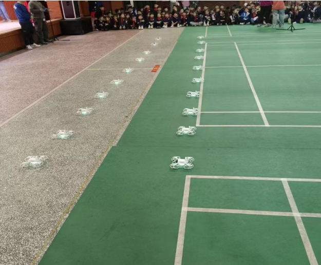 随着表演的开始,无人机群依次腾空而起,不停的变换编队队形,展示出华丽的编队变换,它们时而排成整齐的队列,时而分散成多个小组,在空中编织出一个个错落有致的航线轨迹。整个表演过程中,无人机仿佛成为了天空中的舞者,用它们的飞行轨迹和编队变换,为同学们带来了精彩的表演。
