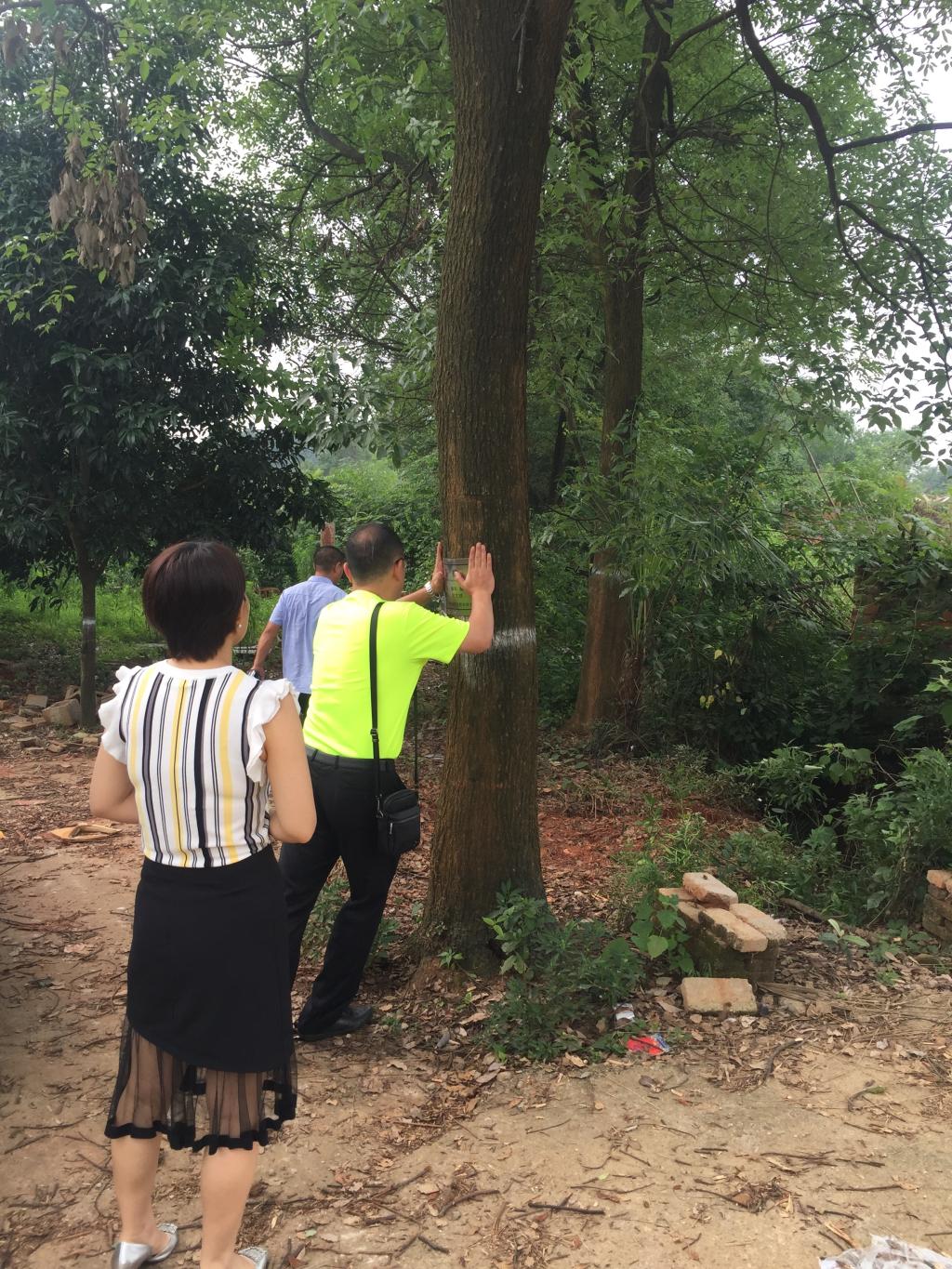 新建办主任潘勇军、副主任徐红丽在高塘岭街道裕农村与苗木捐赠农户对接苗木登记造册及挂牌