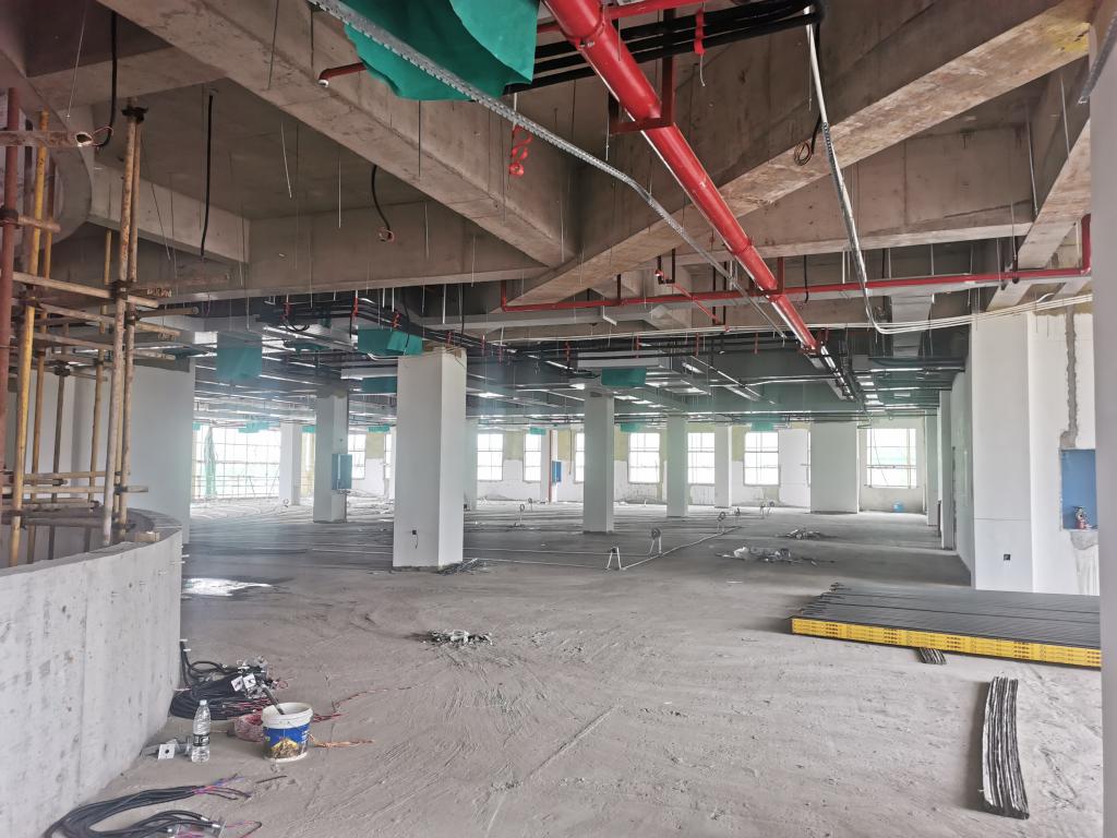 3、3#栋:地面贴砖完成40%,1-3内墙一遍腻子整改完成,楼梯间及六楼二遍完成90%,外墙二遍腻子完成4—6F,一层吊顶完成90%,地下室天花二遍腻子完成20%,卫生间给排水支管完成80%;空调多联机室内机(含铜管、冷凝水管、电源及控制线配管布线等)完成75%;新风风管完成95%;照明、插座、应急照明、消防报警配管、穿线完成95%;配电箱、T接箱安装完成50%;