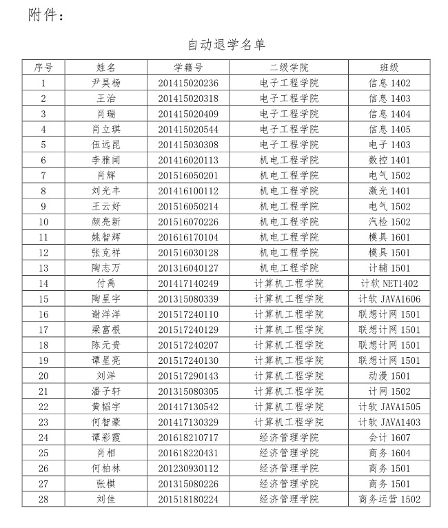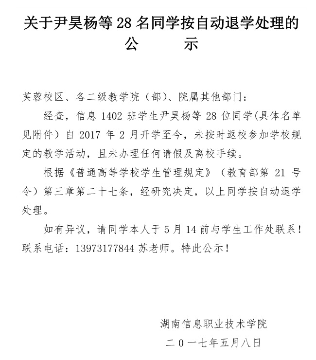 关于尹昊杨等28名同学按自动退学处理的公示