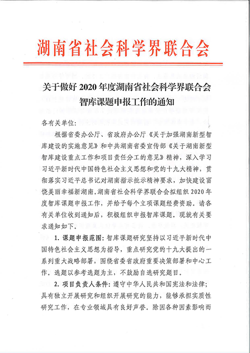 现将转发转发湖南省社会科学界联合会《关于做好2020年度湖南省社会科学界联合会智库课题申报工作的通知》转发给大家,有意申报的教师认真学习通知,了解智库课题申报要点,积极申报。