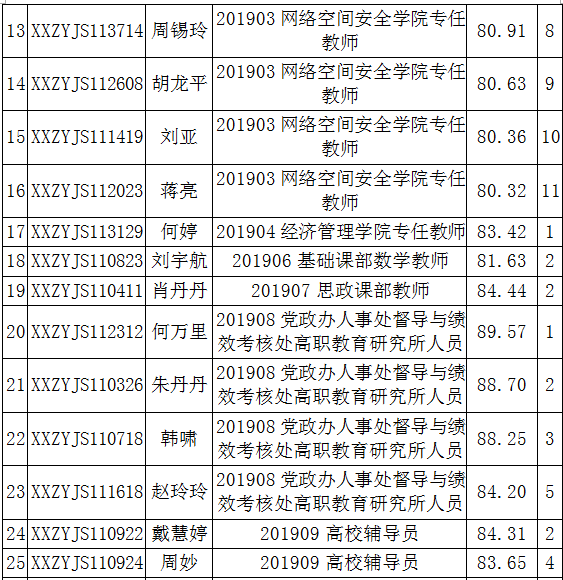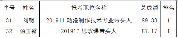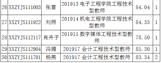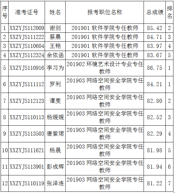 说明:1.软件学院专任教师(岗位编号201901)总成绩第一名放弃考察资格,递补对象怀孕未完成体检;2.基础课部数学教师(岗位编号201906)总成绩第一名放弃体检资格,总成绩第二名为递补对象;3.思政课部教师(岗位编号201907)总成绩第一名怀孕未完成体检;4.党政办人事处督导与绩效考核处高职教育研究所人员(岗位编号201908)总成绩第四名放弃考察资格,总成绩第五名为递补对象;5.高校辅导员(岗位编号201909)总成绩第一名还在考察环节;6.高校辅导员(岗位编号201909)总成绩第三名怀孕未完成体检;7.软件技术专业带头人(岗位编号201910)总成绩第一名还在考察环节。