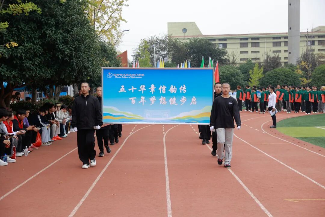 伴随着激昂的《运动员进行曲》,国旗方阵率先入场,庄严肃穆;校旗与“五十华章信韵传,百年梦想健步启”主题标语牌紧随其后,展现学院深厚底蕴与奋进精神。彩旗方阵与各学院学生及教师方阵队依次走过主席台,大家步伐整齐、口号嘹亮,以创意造型展现专业特色,引得全场掌声雷动。