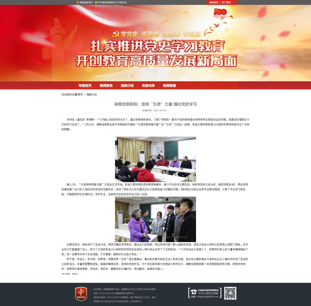 4月2日,湖南省教育厅官网发布《湖南信息职院:发挥“五老”力量 强化党史学习》。