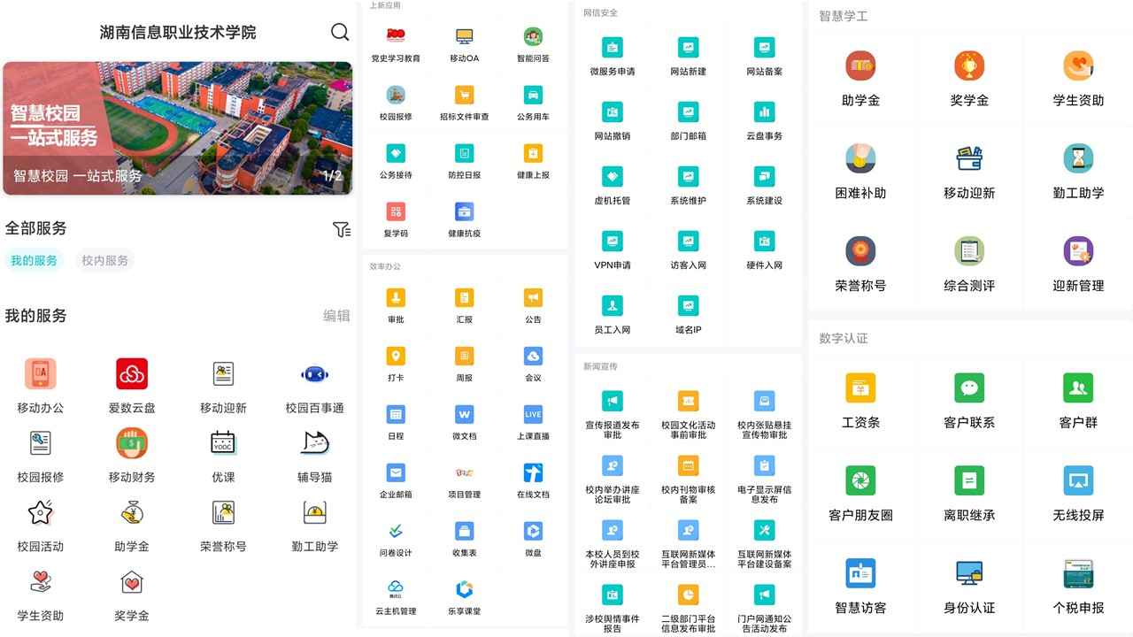 4月20日,学院移动网上办事大厅正式启动上线,实现以师生员工为主要服务对象,以师生需求为向导,打造“一网通办”的新型模式。移动网上办事服务大厅将进一步加强对学院日常管理和服务工作的信息化支撑力度,提高师生办事体验,逐步实现校务服务事项全流程“网上办”、“掌上办”,真正做到为学院师生办实事,实现“师生少跑腿,数据多跑路”。