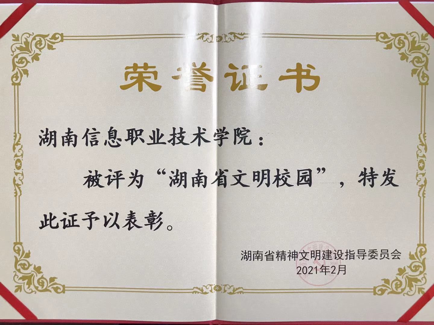 近日,湖南省精神文明建设指导委员会发布《关于表彰2020届湖南省文明城市、文明村镇、文明行业、文明单位、文明标兵单位、文明家庭、文明校园、文明标兵校园的决定》,湖南信息职院获评“文明校园”荣誉称号。