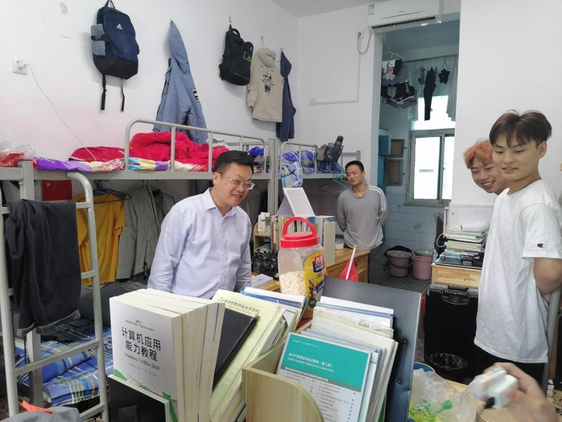 为了深入了解学生宿舍管理和宿舍文化建设情况,促进学风建设。5月12日下午,党委书记贺代贵、副院长苏基协一行深入走访调研了5栋学生宿舍,对同学们的学习、生活情况进行了深入了解,学生工作处、后勤处相关负责人参加。