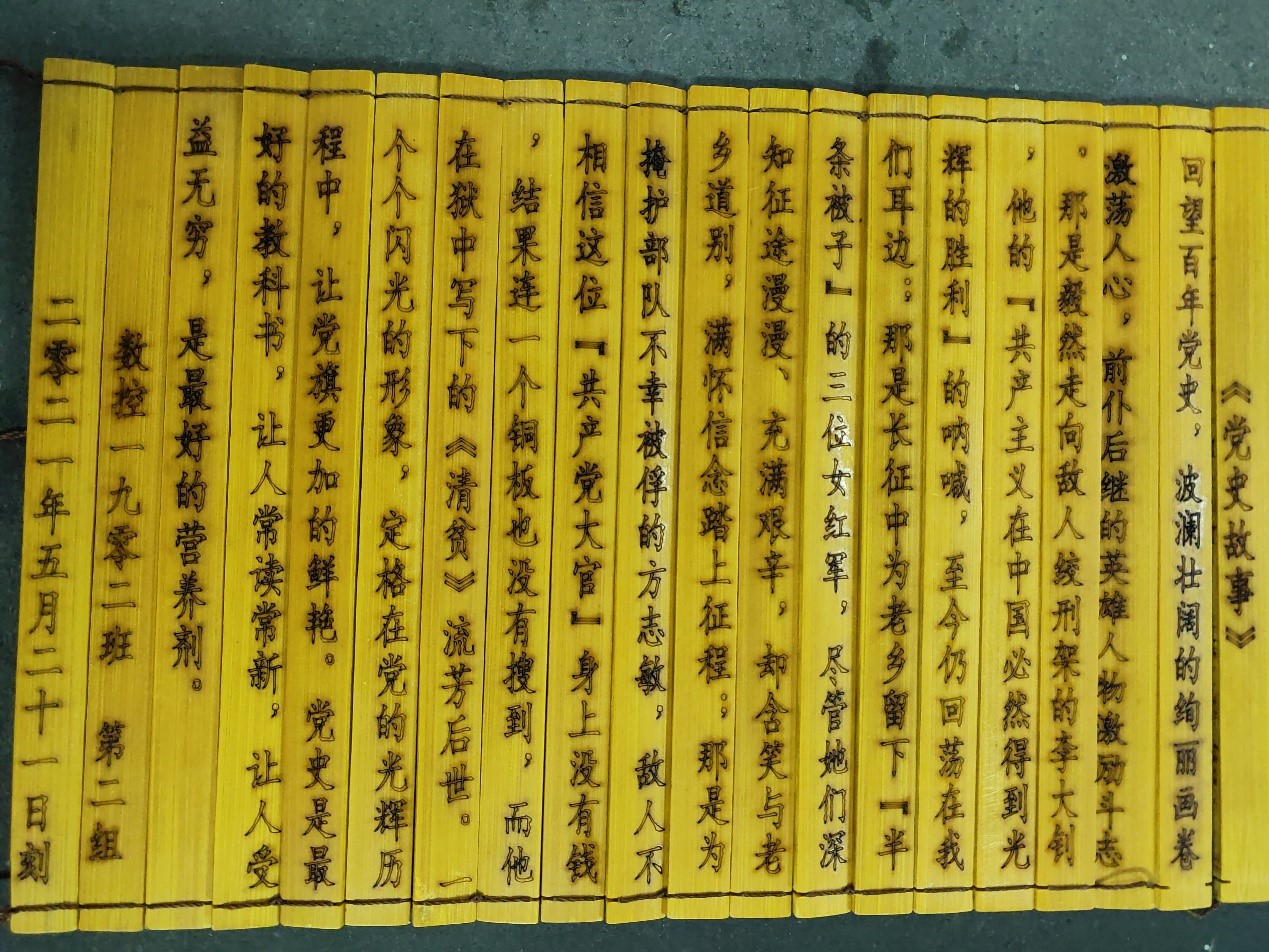 在学院党总支和教研室的指导下,学工支部党员老师郭纪斌积极进行专业课程授课方式创新,在《零件光电加工实训》课程中,他以“四史”中关键的历史节点和具有重大意义的历史事件为切入点,指导学生利用激光打标、激光雕切等专业技术手段,把党的奋斗史、革命前辈的无私奉献精神通过作品的形式展示出来,充分调动了同学们的参与性,加强了师生互动。