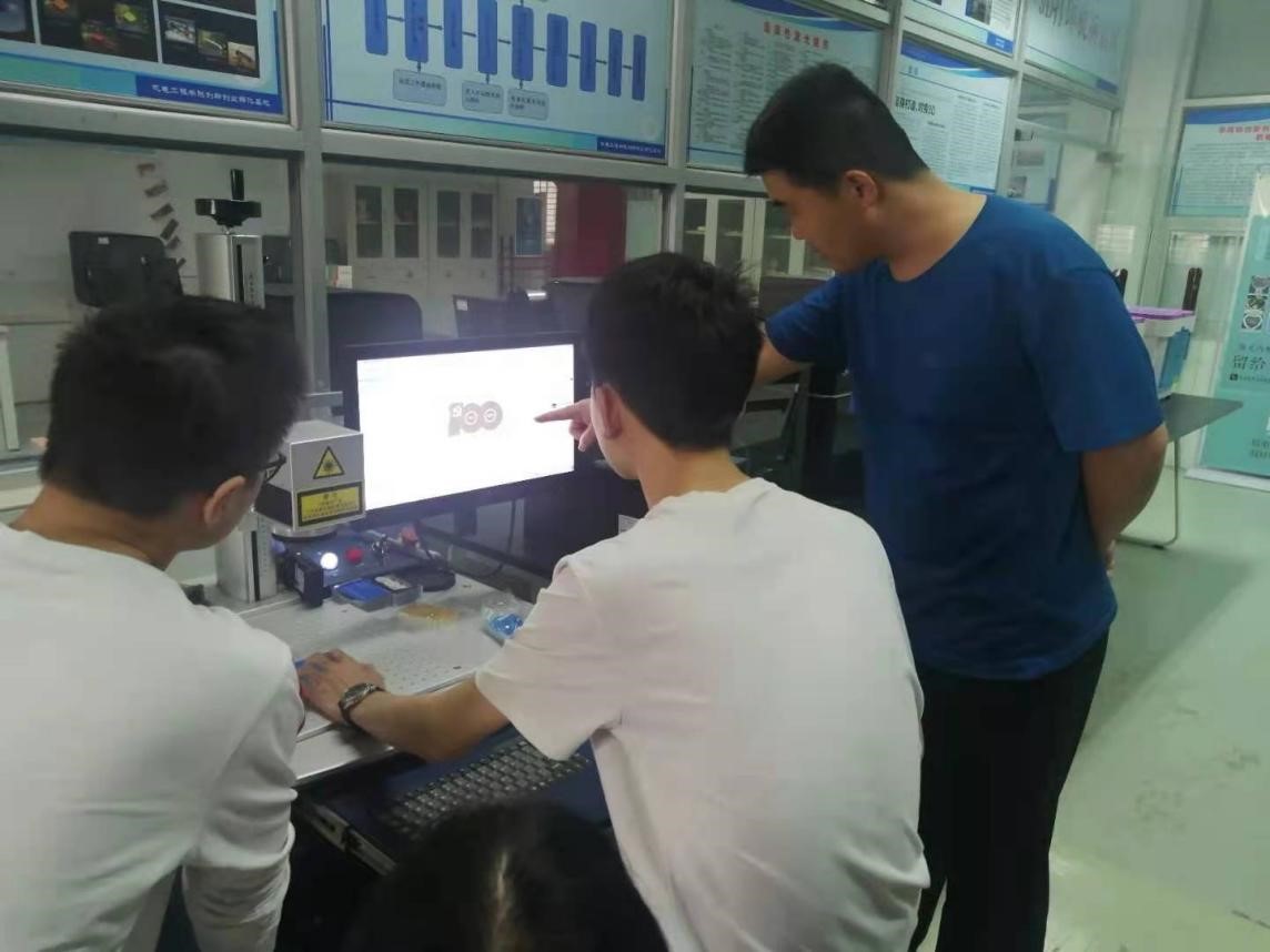 郭纪斌老师在实训室指导学生激光打标建党100周年庆祝活动标识