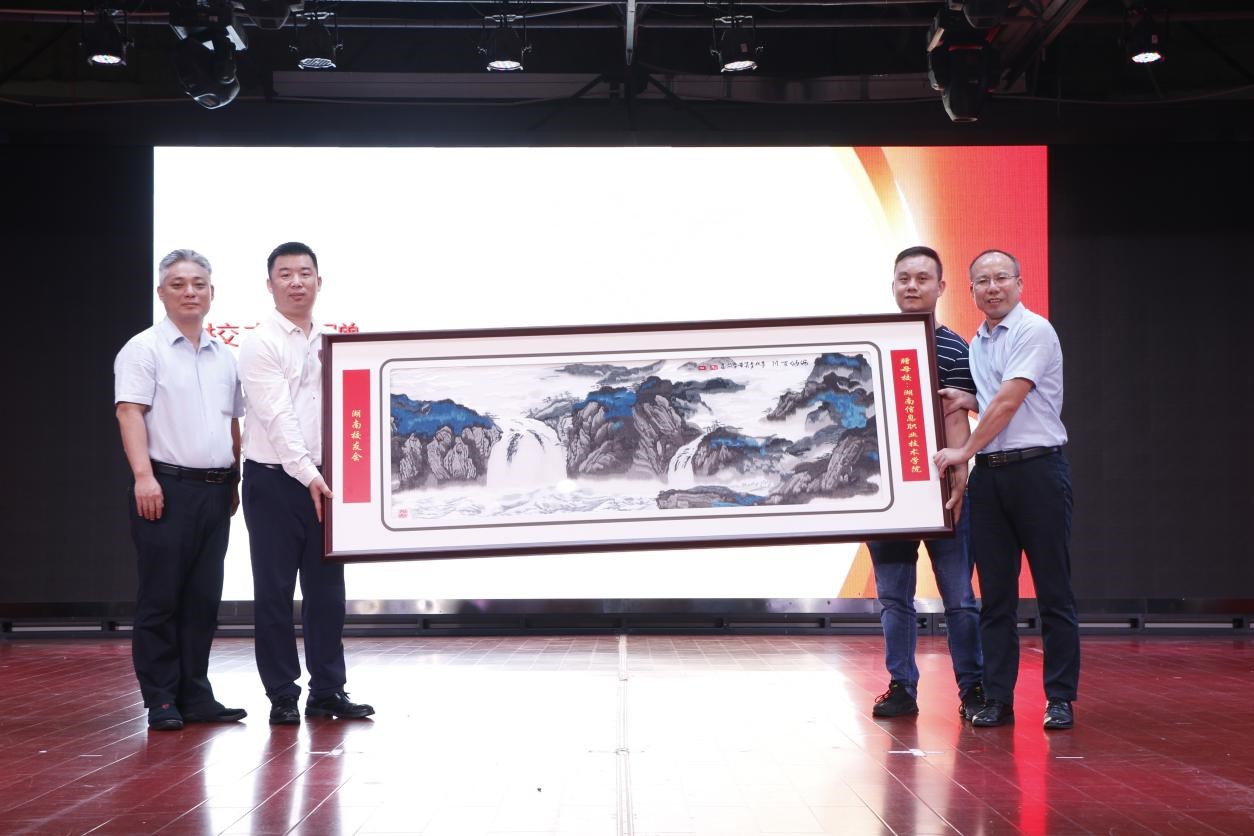 会上,副院长余求根宣读了《同意设立beat365英国官方网站湖南校友会联络办公室》的批复。院长陈剑旄致辞,祝贺湖南信息职业职业技术学院湖南校友会联系办公室设立大会成功举行,并代表母校老师为全体校友送上了祝福和美好祝愿。湖南省数字经济促进会会长、益丰大药房数字化中心负责人、校友会长黄辉表态发言,表示将尽心尽力为广大校友服务,搭建好校友与母校之间的沟通的桥梁,更好的回馈母校。5位校友代表分别就自己的经历分享与母校的点点滴滴,将在座的各位校友带回到曾经的校园生活。黄辉会长及校友代表上台给母校捐赠台匾,祝福母校越办越好。最后,由党委书记贺代贵宣布beat365英国官方网站湖南校友会联络办公室设立,宣告了本次大会圆满成功。