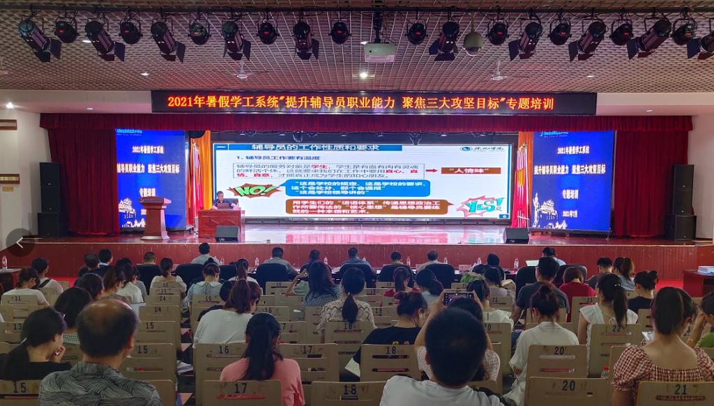 7月14日,学院开展了以“聚焦三大攻坚目标,提升辅导员职业能力”为主题的2021年暑期学工系统人员专题培训。学院党委副书记苏基协出席并作专题宣讲,学生工作系统75人参加。