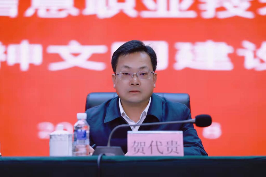 贺代贵指出,精神文明建设要以习近平新时代中国特色社会主义思想为指导,学院精神文明建设是一项民生工程和民心事业,是坚持社会主义办学方向和立德树人的根本任务,是筑牢社会主义共同理想的思想家园和基础。他强调,要深化对精神文明建设工作的认识。精神文明建设能铸就校园之魂,让校园更加文明;能打牢校园文化之基,让生活更加美好;能夯实校园之本,让师生更加幸福。通过传播向上、向善的正能量,守正创新举旗帜、聚民心、育新人、展形象,让校园更和谐、让环境更优美、让生活更精彩。要切实增强精神文明建设的责任感与使命感。要增强责任感,落实立德树人任务,建设精神文明高地;要增强紧迫感,注重守正创新、弘扬主旋律,守好意识形态的底线和红线;要增强压力感,发挥关键少数和中坚力量作用,对标省、市战略和上级要求扛实扛牢主体责任。要着力把握精神文明建设工作的重点。要突出问题,整改抓落实;要突出工作重点抓落实;要突出常态长效抓落实,完善工作体制和机制。要处理好点和面的关系,虚和实的关系,软和硬的关系,做到统筹结合,凝聚共识,主动担当作为。要着力完善精神文明建设建设工作的机制。健全领导机制、规范监督机制、优化考评机制,将机制建设与学院中心工作同研究、同部署、同推进、同考核。他表示,精神文明建设决定我们的新形象、决定我们未来的道路,决定我们的新作为,要做到上下同欲,万众一心,统一思想;要做到有效沟通,强力管控,重塑好口碑;要做到立足岗位,履职尽责,弘扬正能量,把思想行动意志统一到党委行政的决策部署和安排上;要同做一个学院发展建设梦,扩大公约数,画好同心圆,确保“三大攻坚目标”圆满完成。