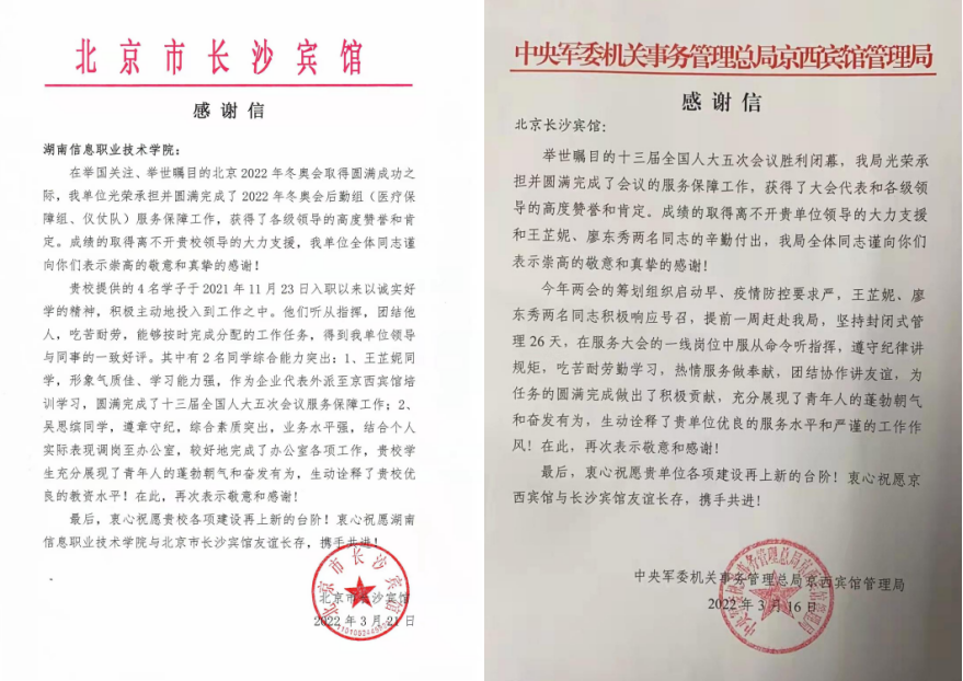 “贵校学生充分展现了青年人的蓬勃朝气和奋发有为,生动诠释了贵校优良的教资水平。在此,再次表示敬意和感谢!”近日,beat365收到了来自北京市长沙宾馆和中央军委机关事务管理总局京西宾馆管理局的两封感谢信。感谢信中对beat365两名应届毕业生吴思缤(会计1905班)、王芷妮(商英1902班)在举国关注、举世瞩目的2022年冬奥会后勤服务保障工作和十三届全国人大五次会议服务保障工作中的表现表示肯定,用人单位(北京市长沙宾馆)表示还会继续加深与学院的合作,在服务学生高质量就业上夯实合作基础,扩大合作领域,实现学院、学生和用人单位互利共赢。