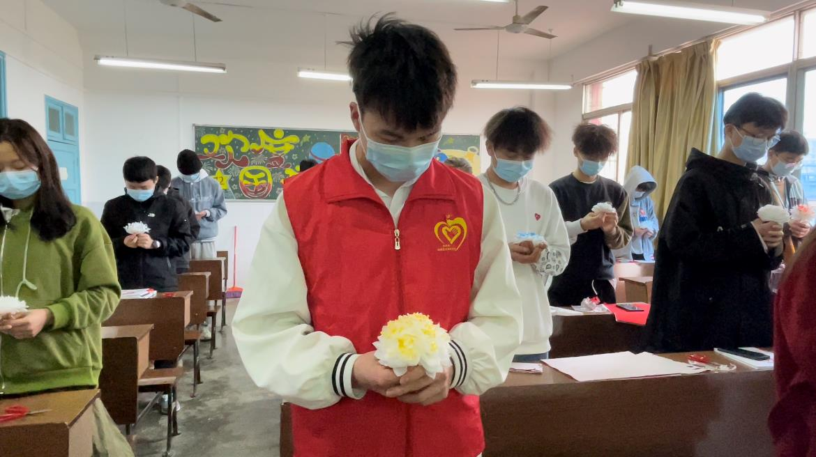 “万物复苏风回暖,又是一年清明时。清明是缅怀先人,慎终追远的传统文化节日。”活动开始,党员教师一边讲解清明节的由来、习俗等文化常识,一边向同学们演示着纸花的制作过程。在制作纸花过程中,有同学动情地表示:“在这个特殊的节日,我愿献上一朵亲手做的黄花,寄托自己对英雄和先烈们的哀思。”活动的最后,全体人员持花默哀一分钟。