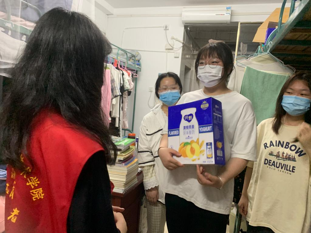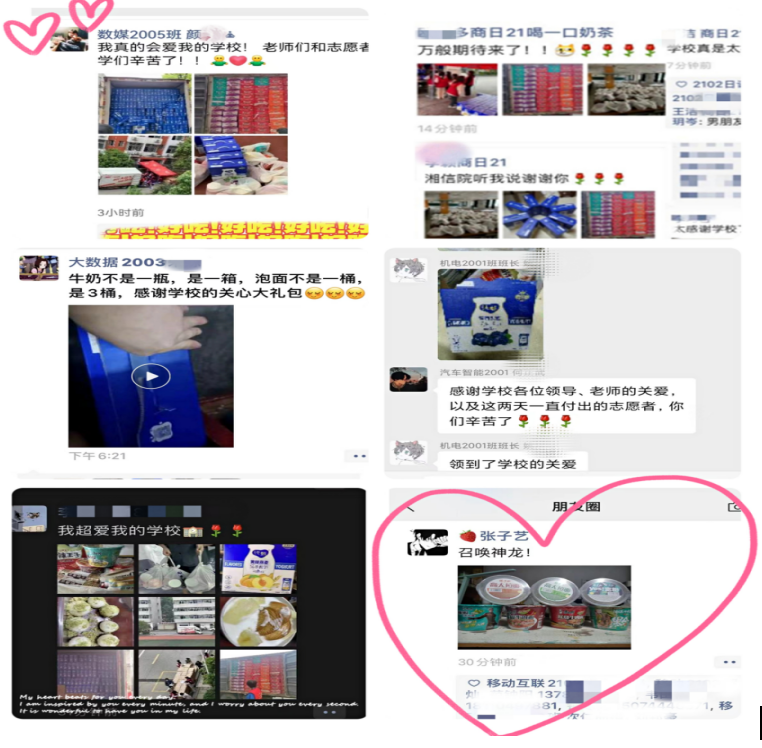 “湘信院暖你一整天”“学校想的太周到了,看到志愿者们送到宿舍的爱心大礼包,真的非常感动” “大爱湘信院、感动湘信院,你永远可以相信湘信院”“有湘信院的世界最美丽”……收到大礼包的同学们动情地说道。