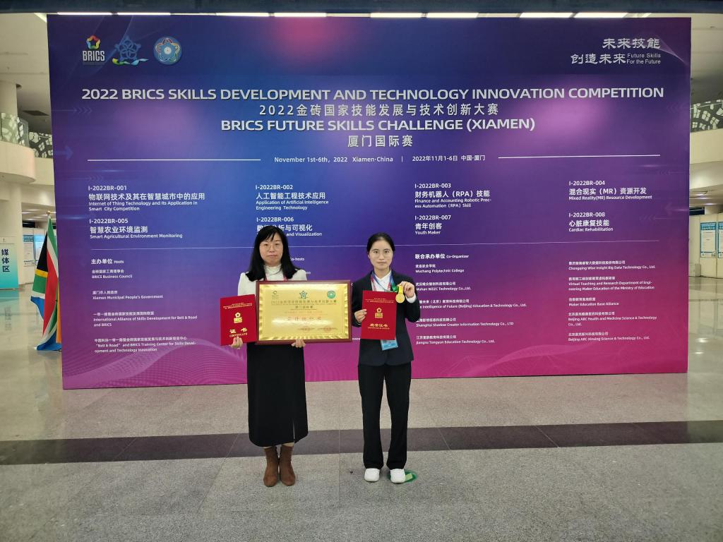 2022金砖国家技能发展与技术创新大赛厦门国际赛共有财务机器人(RPA)技能、物联网技术及其在智慧城市中的应用、人工智能工程技术应用等8个赛项。大赛聚焦高端制造、数字经济、新产业、新业态、新技术等重点领域,综合考察参赛选手对机器人技术开发运用、解决问题能力和在高压环境下临场理解力、抗压力等综合职业素养。学院杨旺同学从省赛到国内赛,再到国际赛,备赛期间夯实基础,苦练技能,在这次国际赛中与来自金砖国家的各高职院校顶尖人才同台比拼技能技术,充分展现了扎实的专业功底,最终取得佳绩。