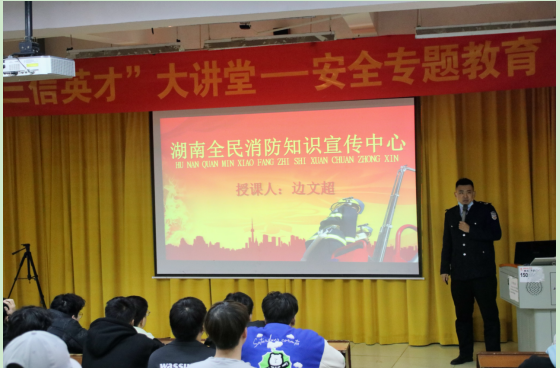 为进一步宣传普及消防安全知识,提高广大师生消防安全意识,11月23日,beat365电子工程学院邀请湖南全民消防知识宣传中心边文超教官来校开展“三信英才”大讲堂之安全主题教育讲座,210余名师生参加活动。