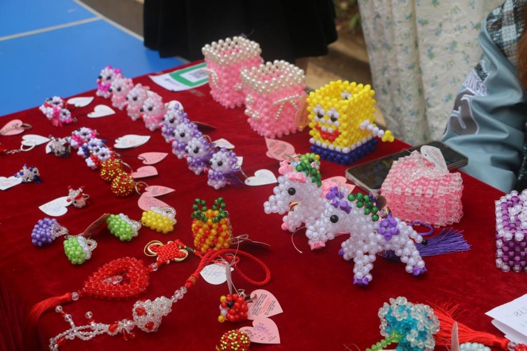 展台上摆满了残障人士亲手制作的天使熊、双层玫瑰、小福袋、手机包、流氓兔等手工艺卖品,这些手工艺品的制作工时最少需要花费两小时,最多的甚至历时一周才能完成。在志愿者们的大力宣传之下,路过的同学们纷纷驻足脚步,对手工艺品进行挑选,来参观和购买的同学络绎不绝,义卖现场可谓“生意”兴隆。在同学、老师和义卖活动志愿者们共同的努力下,爱心义卖总金额已达上千元。据悉,义卖筹集到的资金将全部交给长沙市芙蓉区欣心翼精神康复中心会所,作为残疾人手工艺品的报酬。