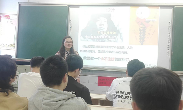 《机械制图》是采用尺规等手工工具将机械零件或产品用标准、规范的方法表达出来的一门技术语言,其中学会画螺丝钉是很重要的一个环节。在进行螺丝钉画法的教学时,彭老师引用雷锋同志语录启发学生,“螺丝钉有两个好处,一个是挤劲、一个是钻劲。我们在学习上要提倡这种‘钉子’精神,善于挤和钻”。