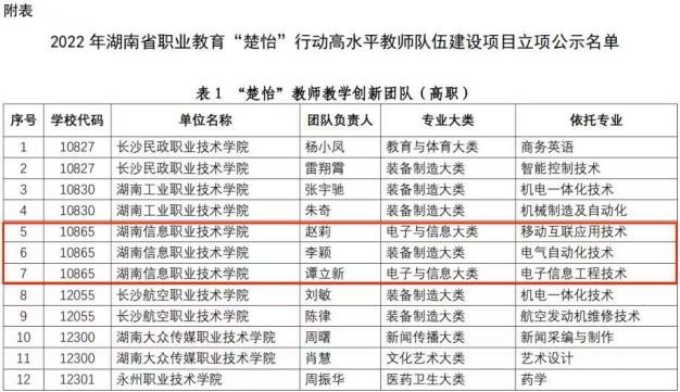 近日,湖南省教育厅公布了2023年职业教育“楚怡”行动高水平教师队伍建设项目的遴选结果,beat365立项“楚怡”教师教学创新团队3个、“楚怡”思想政治教育教学创新团队培育项目1个、“楚怡”名师工作室2个、“楚怡”教学名师1个、“楚怡”工坊1个。2022年,李璐老师获长沙市第六届“感动星城·十大魅力教师”提名奖,金艳老师获长沙市优秀思政教师奖;大学英语教学团队获评湖南省高校外语课程思政教学团队;学院引培博士、教授20名,晋升“三级教授”1名;聘请产业导师5名;培育省级青年骨干教师3名,遴选校级优秀教师25名;省级芙蓉教学名师谭立新教授获验收通过。