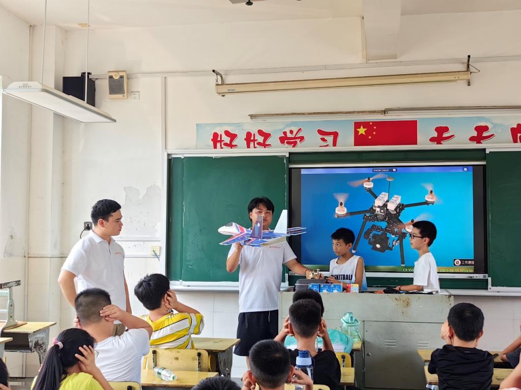 一问一答间好奇和求索的种子已悄然种在了孩子们的心中。湖南信息职院暑假“三下乡”教育关爱团的志愿者带着无人机模型和飞机模型走进课堂,为孩子们讲解无人机的构成、飞行原理、飞行安全等知识,为了让孩子们更直观地了解无人机,志愿者们一边讲解,一边通过手工实验进行操作展示。“哇!我的无人机飞起来喽!”课堂外,孩子们的惊叹声、笑声此起彼伏。“我从来没有上过这种类型的课,太有意思了!学到了很多之前没有接触过的新知识,科技真的能改变生活,我也要好好学习!“路口镇中心小学五年级的方嘉薇兴奋地说道。近距离接触无人机、操作无人机对路口镇中心小学的孩子们来说是一次新奇的体验,无人机知识科普课激发了学生们探索世界的兴趣,培养了创新思维和实践能力。