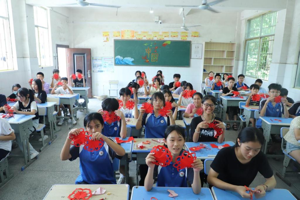 在皮影戏教学现场,志愿者们化身为传承人,打开皮影制作材料包,将胳膊、腿等关节处固定,安装上操作杆,邀请在场学生一起上台进行皮影表演。同学们充分发挥创造力,展开丰富的联想,亲手操纵皮影杆,上下翻飞做出各种有趣的动作,在零距离接触传统文化的同时,对皮影戏产生了浓厚的兴趣。在剪纸技艺课堂上,志愿者从折纸、绘画、剪纸一步一步教起,引导学生画出他们心中的图景,然后动手裁剪,原本一张张平凡无奇的红纸不一会就变成了一朵窗花、一个“囍”字、一只兔子...形态各异。今年初三的唐志祥在志愿者的帮助下,逐渐领会和掌握了剪纸技艺,他说“这堂课让我学习了丰富的剪纸技艺文化,感受到了剪纸的乐趣”。此外,小分队为助力乡村推普工作,促进中华优秀语言文化传承,通过讲故事、绕口令等形式给学生们上了一堂普通话课,并沿街发放推广普通话宣传单,耐心向村民宣讲普通话的相关知识及普及意义,倡导在日常生活中养成说普通话的好习惯。