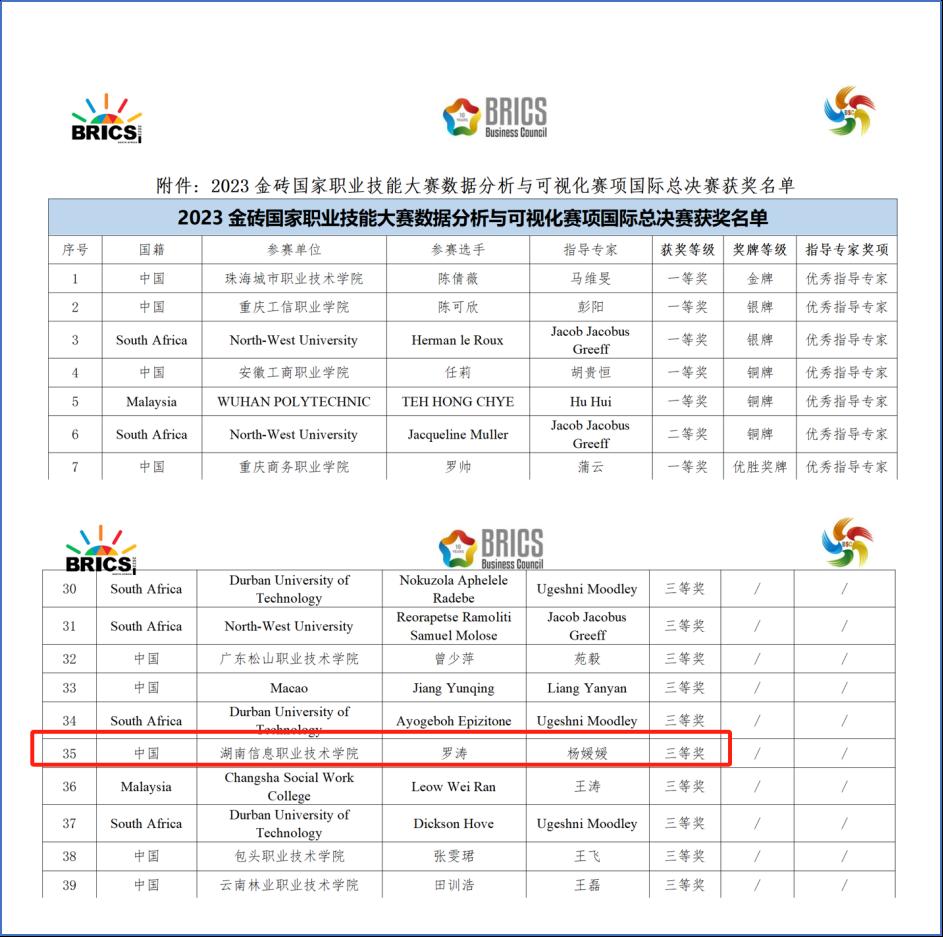 11月21日,2023年金砖国家职业技能大赛“数据分析与可视化”赛项国际总决赛获奖名单公示,beat365网络空间安全学院学子罗涛斩获三等奖。本次总决赛共138支代表队参赛,经过多轮角逐,罗涛凭借优异的成绩脱颖而出,为学院摘得国家级奖项1枚。