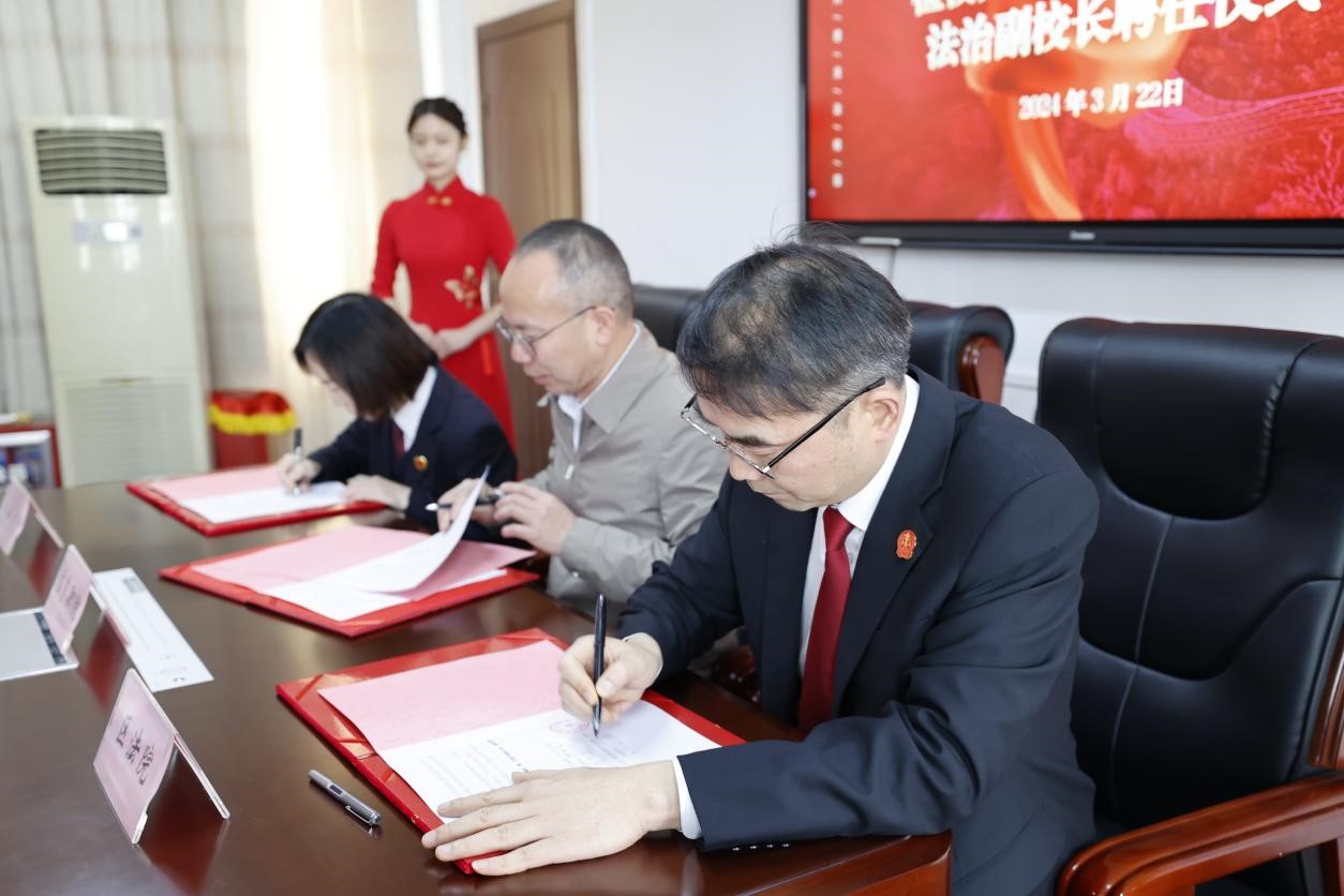 苏基协宣布聘任曾陕青、江朔为学校的法治副校长。朱焕桃为法治副校长颁发聘书;学校分别与望城区人民法院、望城区人民检察院签署法校共建协议、检校共建协议。