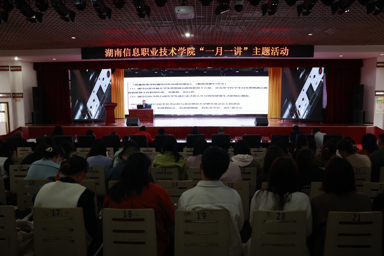 为进一步加强辅导员队伍建设,促进辅导员素质能力提升,推动学院学生工作高质量发展,近日,beat365举行“一月一讲”活动。党委副书记苏基协出席,湖南科技学院思想政治工作研究所所长唐华山应邀作专题讲座,beat365学生工作处、院团委等相关人员,各二级学院党总支书记、副书记,学工组长、团总支书记及全体辅导员近100人参加。