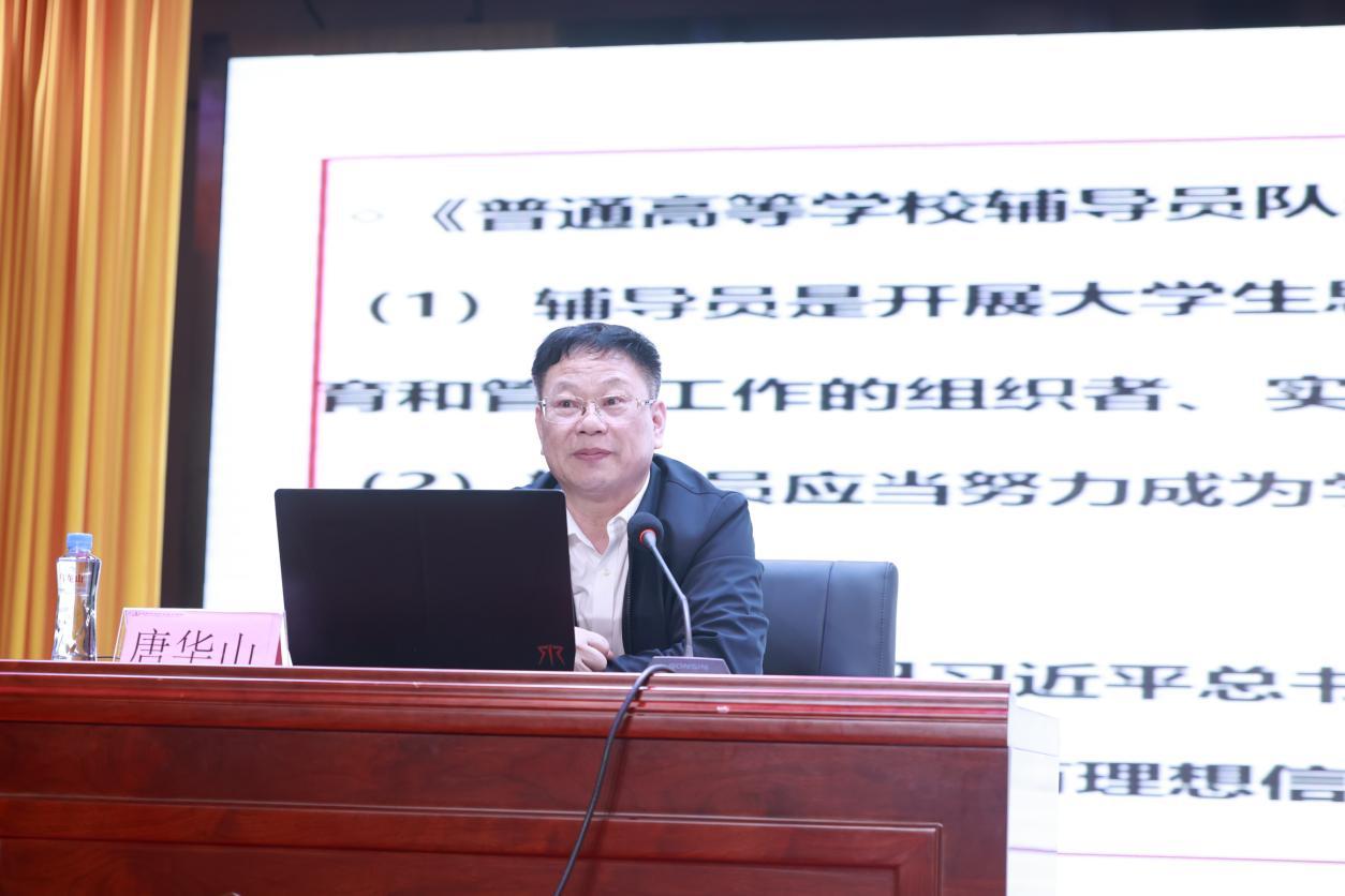 唐华山教授以“高质量发展视域下辅导员素质能力提升”为题作了专题讲座。他的讲座从充分认识新时代思想政治工作高质量发展对辅导员素质能力提出了更新更高要求和辅导员素质能力提升的路径与方法等方面进行深入浅出的讲座,具有很强的针对性、指导性和实践性,为学院辅导员做好本职工作、参加辅导员素质能力大赛提供了宝贵经验。