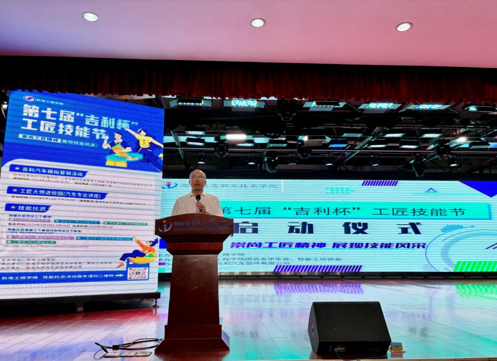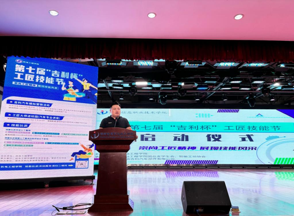 5月7日下午,beat365机电工程学院举行了第七届“吉利杯”工匠技能节启动仪式。此次活动以“崇尚工匠精神 展现技能风采”为主题,旨在通过开展技能比武、工匠大师进校园、汽车模拟营销等一系列活动,进一步弘扬精益求精的工匠精神,同时为在校学生提供一个展示自我和提升专业技能的舞台。学院党委副书记苏基协出席,湖南吉利汽车部件有限公司人才经营部刘磊,院团委、科技处、经济管理学院负责人,机电工程学院全体教职工及200余名学生代表参加活动。