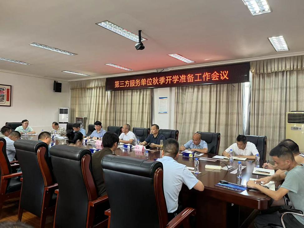 后勤处负责人传达了省教育厅《关于做好2024年秋季开学安全稳定工作的通知》文件精神。第三方服务项目负责人介绍了开学准备工作。有关部门负责人围绕学生管理、后勤保障等与服务单位进行了沟通交流。
