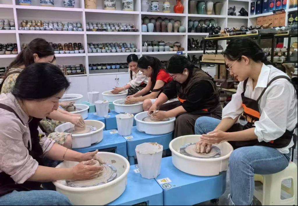 活动当日,教师们通过沉浸式文化体验深入了解长沙铜官窑的千年文脉。在长沙铜官窑博物馆内,专业讲解员通过瓷器展品、多媒体影像及历史文献,系统介绍了铜官窑作为唐代陶瓷重镇的辉煌历史、工艺演变及其在海上丝绸之路中的重要地位。教师们走进陶艺工坊,在陶艺师傅的指导下亲手体验拉坯、塑形等传统制陶技艺,制作出独具个人风格的陶瓷作品。自由交流环节,教师们结合自身课程特色展开讨论,讨论了如何将陶瓷艺术的美学理念、历史背景融入美育课程设计,或借鉴茶艺等传统技艺的实践教学经验,探索传统文化与现代课堂的融合路径。