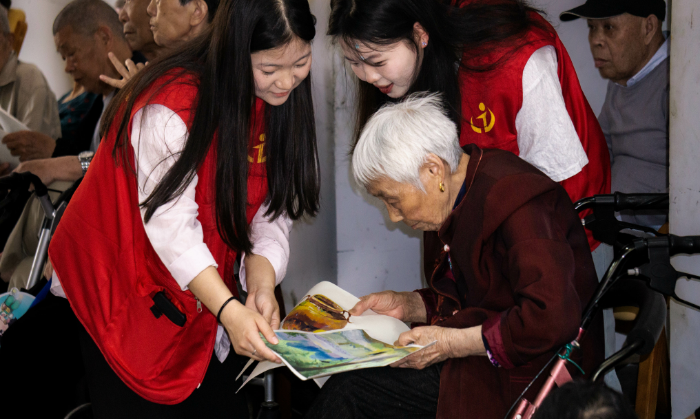 志愿者为老人赠画