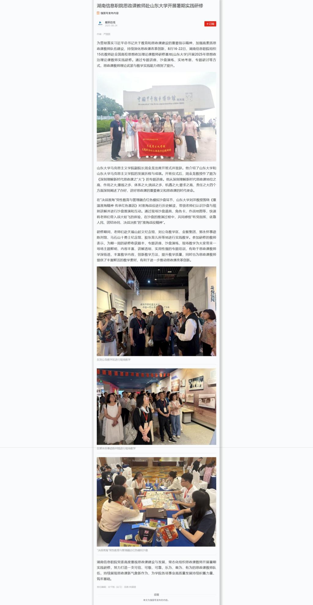 8月24日,学习强国发布《湖南信息职院思政课教师赴山东大学开展暑期实践研修》