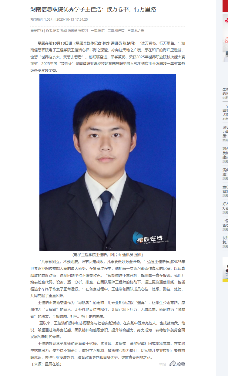 10月13日,星辰在线发布《湖南信息职院优秀学子王佳浩:读万卷书,行万里路》