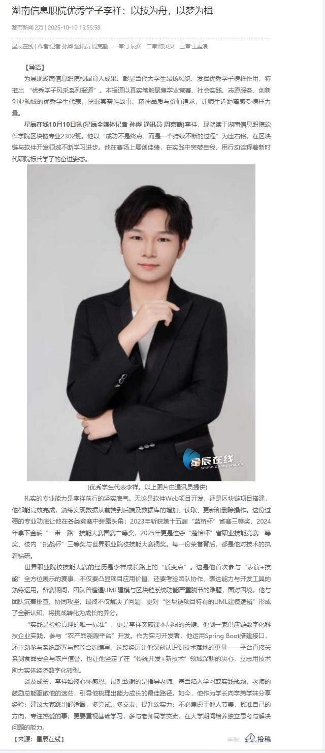 10月10日,星辰在线发布《湖南信息职院优秀学子李祥:以技为舟,以梦为楫》