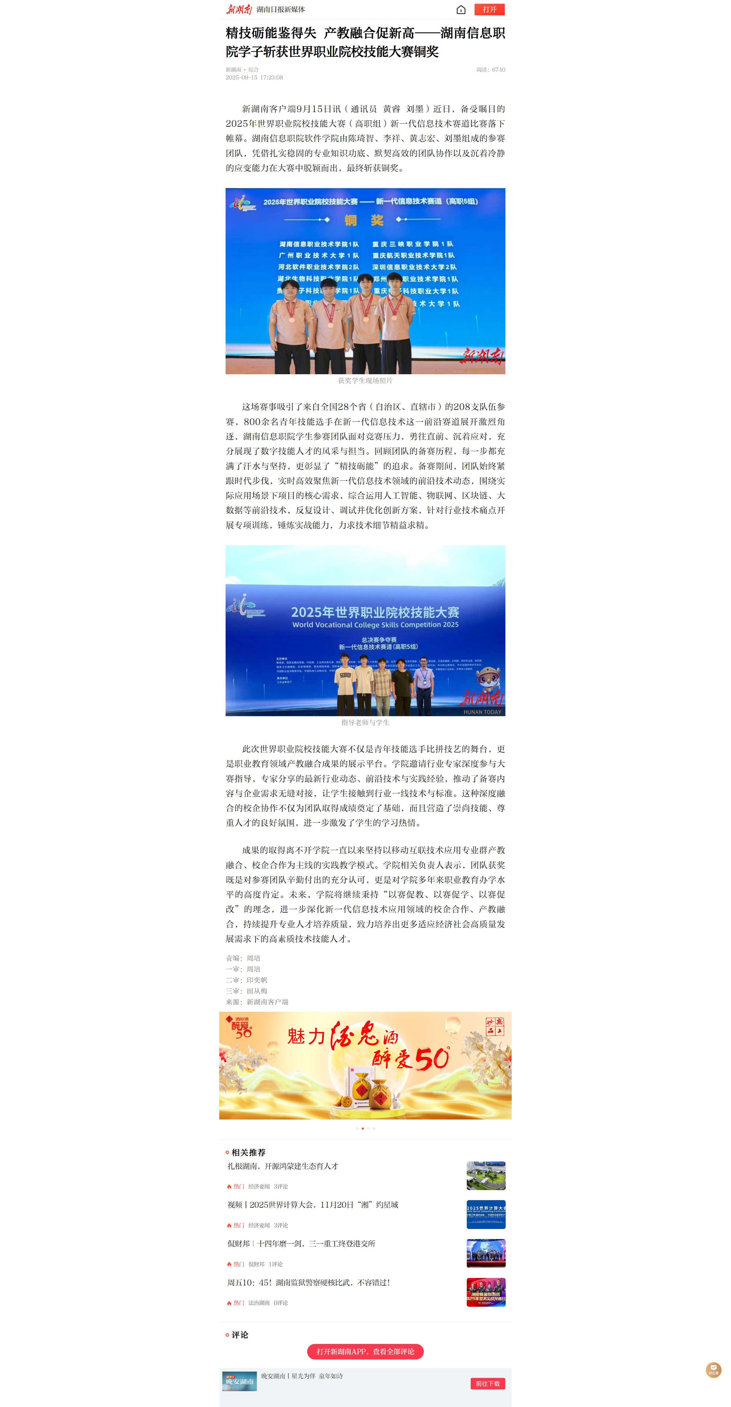 9月15日,新湖南发布《精技砺能鉴得失 产教融合促新高——湖南信息职院学子斩获世界职业院校技能大赛铜奖》