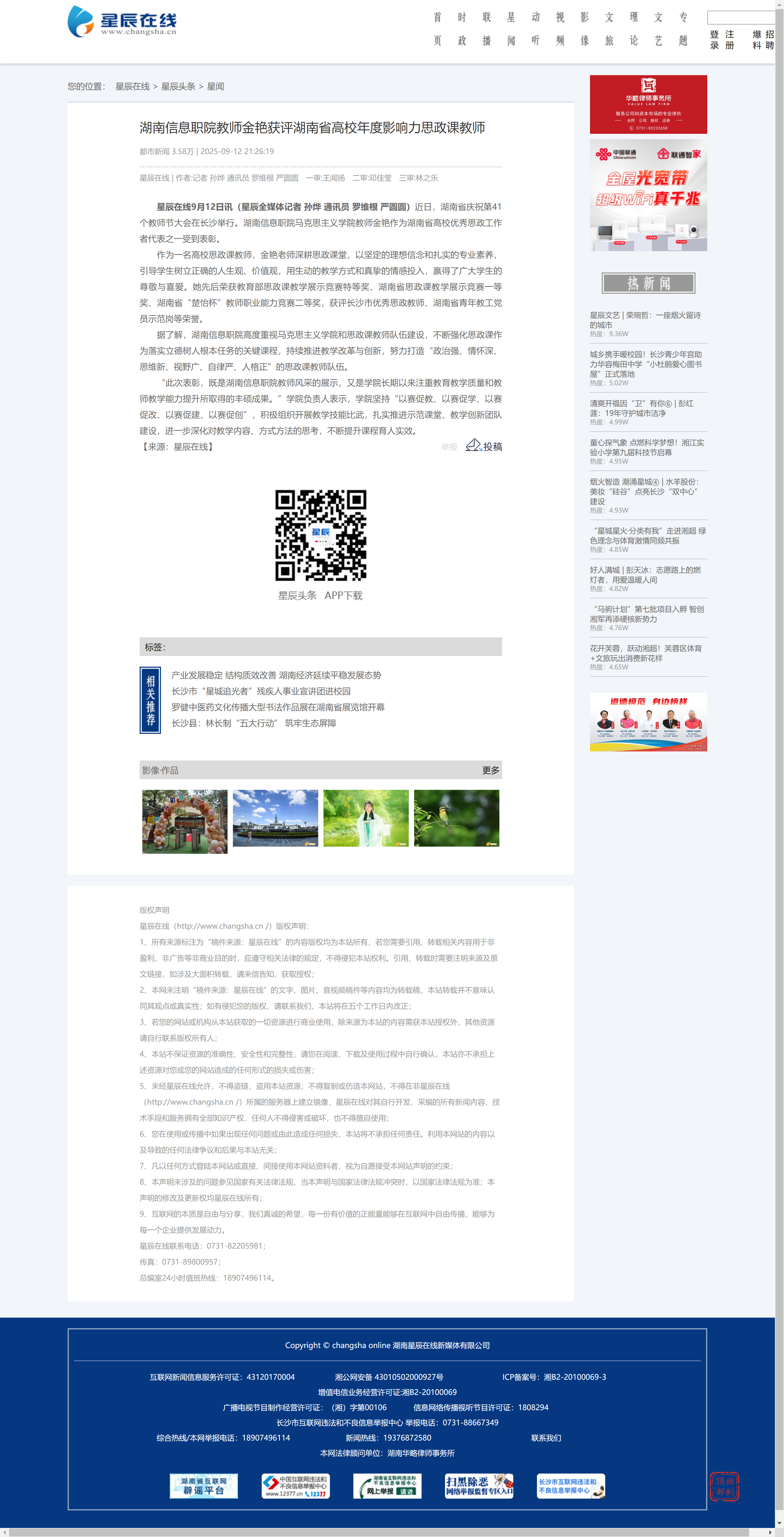 9月12日,星辰在线发布《湖南信息职院教师金艳获评湖南省高校年度影响力思政课教师》