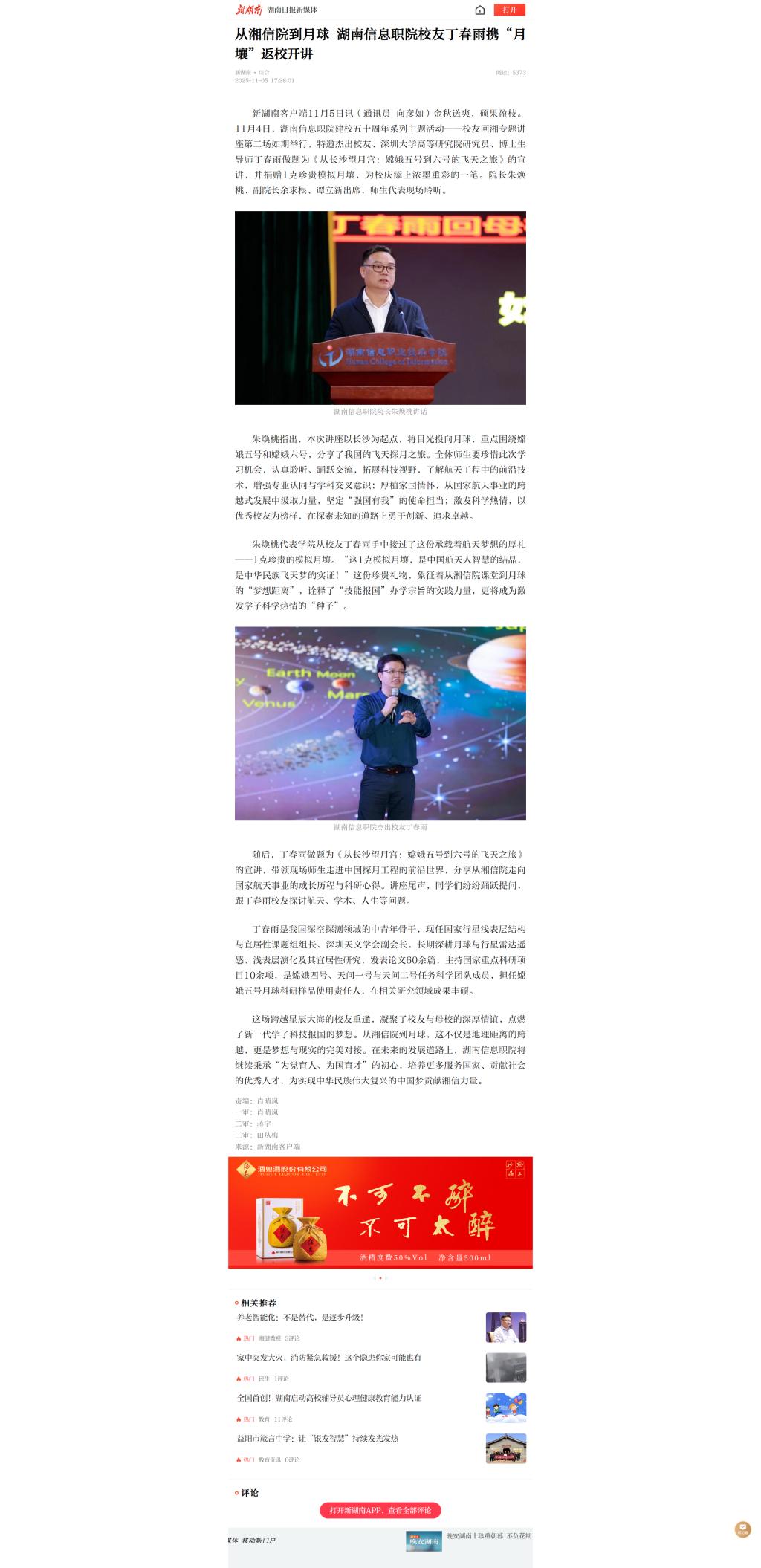 11月5日,新湖南发布《从湘信院到月球 湖南信息职院校友丁春雨携“月壤”返校开讲》