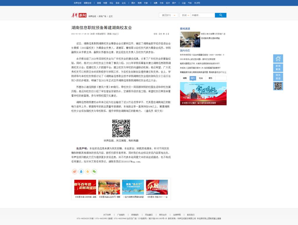 1月20日,华声在线发布《湖南信息职院预备筹建湖南校友会》。