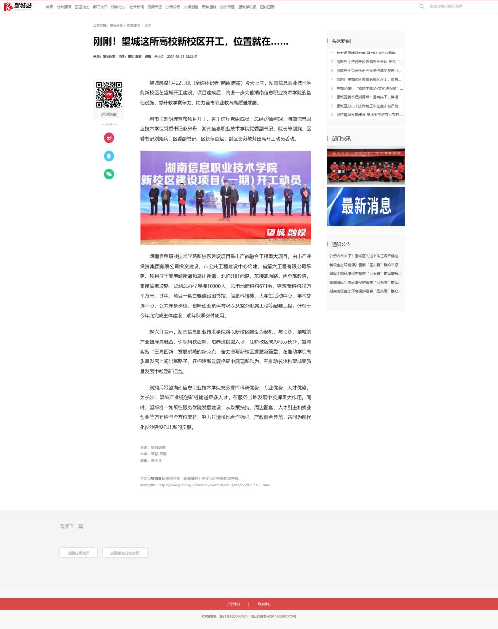 1月22日,红网发布《刚刚!望城这所高校新校区开工,位置就在……》。