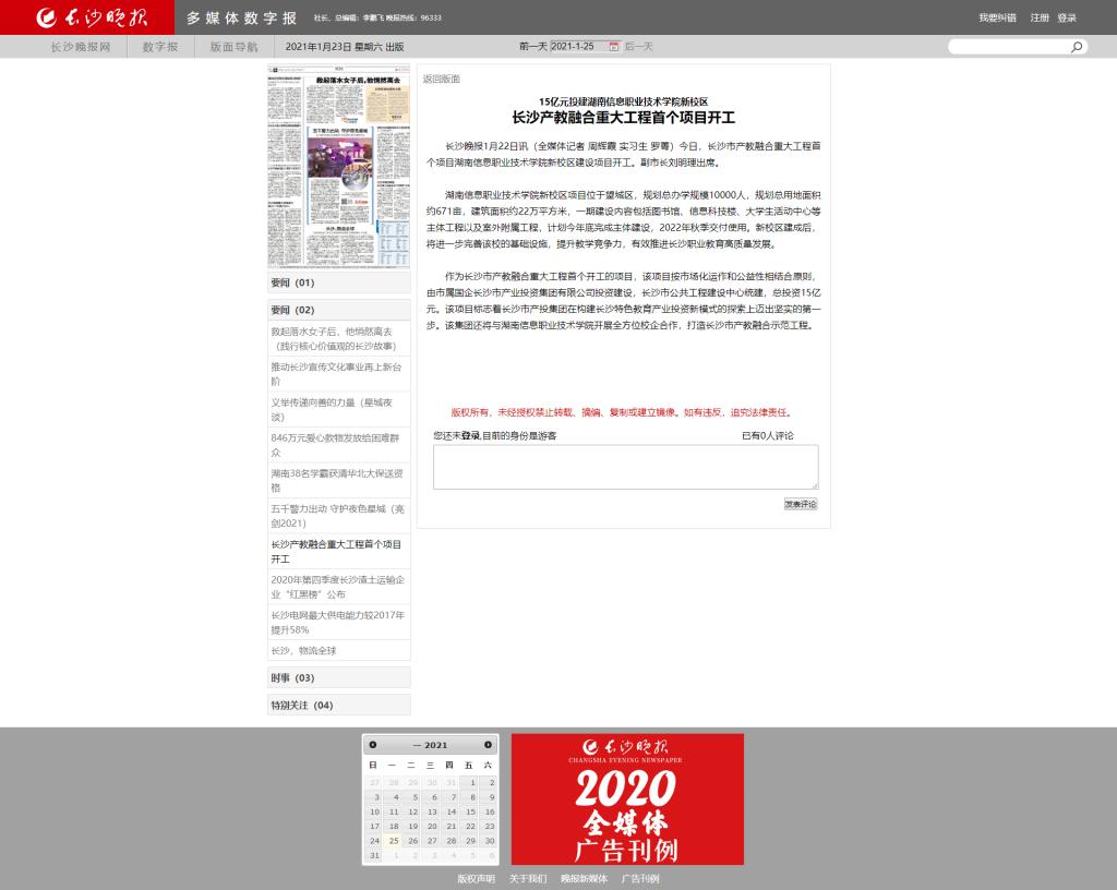 1月23日,长沙晚报发布《长沙产教融合重大工程首个项目开工》。